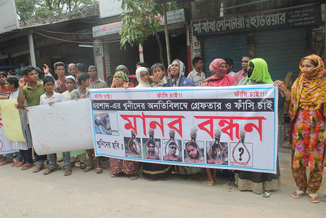 বাংলা ফটো নিউজ : সাভারে জমি সংক্রান্ত বিরোধের জেরে প্রতিপক্ষের হামলায় নিহত এরশাদ শিকদারের খুনিদের দ্রুত গ্রেফতার ও ফাঁসির দাবিতে মানববন্ধন করেছে এলাকাবাসী। শুক্রবার (২৫ মে) দুপুরে সাভারের কলমা এলাকায়