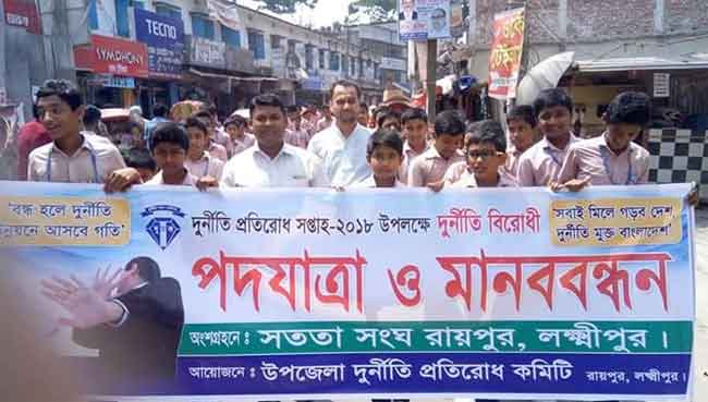 বাংলা ফটো নিউজ (দেলোয়ার হোসেন মৃধা,লক্ষ্মীপুর) : লক্ষ্মীপুরের রায়পুরে দূর্নীতি প্রতিরোধে পদযাত্রা, মানববন্ধন ও আলোচনা সভা আয়োজন করেছে উপজেলা দূর্নীতি প্রতিরোধ কমিটি। আজ বৃহস্পতিবার রায়পুর মাচ্চের্ন্টস একাডেমী মিলনায়তনে আলোচনা সভায়
