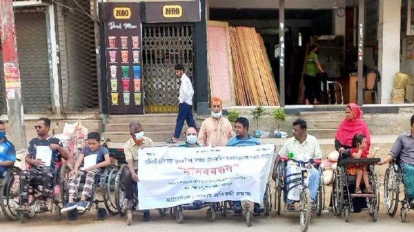 বাংলা ফটো নিউজ : প্রতিবন্ধীদের সরকারি ভাতা ২ হাজার টাকা করা, কর্মসংস্থান সৃষ্টি করাসহ ৭ দফা দাবিতে মানববন্ধন করেছে প্রতিবন্ধী সমাজ। শুক্রবার (১৫ এপ্রিল) দুপুরে সাভারের ঢাকা-আরিচা মহাসড়কের শিমুলতলা এলাকায়