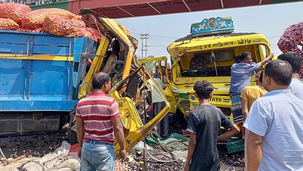 বাংলা ফটো নিউজ : ঢাকা-আরিচা মহাসড়কে পেঁয়াজ ও কয়লা বোঝাই দু’টি ট্রাকের মুখোমুখি সংঘর্ষে দুই চালক আহত হয়েছেন। রবিবার (১৩ মার্চ) দুপুরে ধামরাইয়ের জয়পুরা বাজার বাস স্ট্যান্ডে এ দুর্ঘটনা ঘটে।