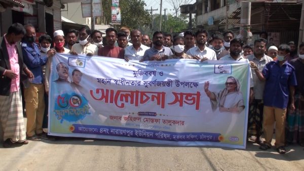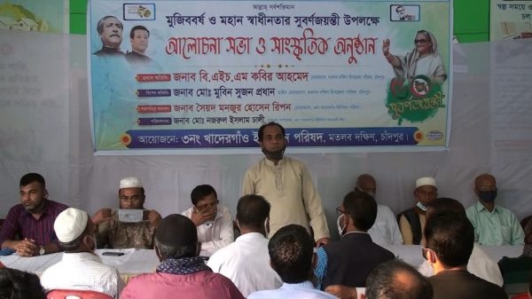 আবু সায়েম মস্টার : চাঁদপুরের মতলব দক্ষিণ উপজেলার খাদেরগাঁও ইউনিয়ন পরিষদের আয়োজিত মুজিববর্ষ ও মহান স্বাধীনতার সুবর্ণজয়ন্তী উপলক্ষে আলোচনা সভা ও মাস্ক বিতরণ অনুষ্ঠিত হয়েছে। বৃহস্পতিবার (৩ মার্চ) বিকালে ইউনিয়ন