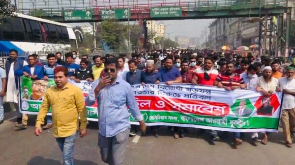 বাংলা ফটো নিউজ : সারাদেশে বিএনপি জামায়াতের সন্ত্রাস ও নৈরাজ্যের প্রতিবাদে সাভারে বিক্ষোভ মিছিল করেছে যুবলীগের নেতাকর্মীরা। শনিবার (৫ মার্চ) দুপুরে ঢাকা-আরিচা মহাসড়কের সাভার বাজার বাসস্ট্যান্ড থেকে মিছিলটি বের হয়।