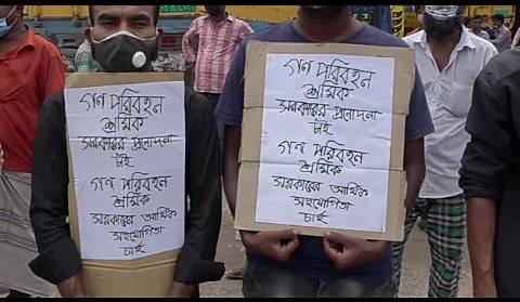 বাংলা ফটো নিউজ : ত্রাণ সহায়তা, শ্রমিক-মালিক সমিতির নামে চাঁদা বন্ধ, গণপরিবহন চালুসহ তিন দফা দাবি আদায়ে বিক্ষোভকারী পরিবহন শ্রমিকদের ত্রাণ সহায়তা দিলেন রঞ্জিত ঘোষ নামে এক ব্যবসায়ী। গতকাল মঙ্গলবার