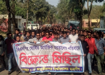 বাংলা ফটো নিউজ : সদ্য সম্পন্ন ঢাকা সিটি করপোরেশন নির্বাচনে ব্যাপক অনিয়মের অভিযোগে রবিবার বিএনপির ডাকা দিনব্যাপী হরতালের প্রতিবাদে বিক্ষোভ মিছিল করেছে জাহাঙ্গীরনগর বিশ্ববিদ্যালয় শাখা ছাত্রলীগ। এ সময় নিজেদের মধ্যে