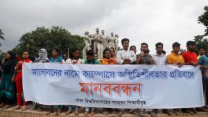 এদিকে ‘অযৌক্তিক আন্দোলনের’ মাধ্যমে ক্যাম্পাস অস্থিতিশীল করার প্রতিবাদে ঢাকা বিশ্ববিদ্যালয় ‘সাধারণ শিক্ষার্থী’র ব্যানারে ছাত্রলীগের নেতা-কর্মীরা রাজু ভাস্কর্যের সামনে সমাবেশ করছেন।