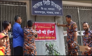 বাংলা ফটো নিউজ : বহুতল ভবনের অগ্নিনিরাপত্তা ব্যবস্থা খতিয়ে দেখতে অভিযান চালিয়েছে সাভার ফায়ার সার্ভিস ও সিভিল ডিফেন্সের ৭ সদস্যের একটি প্রতিনিধি দল। প্রথম দিনের অভিযানে আজ বৃহস্পতিবার (৪ এপ্রিল) দুপুর ৩টা থেকে শুরু করে সন্ধ্যা পর্যন্ত অগ্নিনিরাপত্তা ব্যবস্থায় ত্রুটি থাকায় সাভার পৌর এলাকার একটি আবাসিক ও দুইটি বানিজ্যিক বহুতল ভবনকে অগ্নি ঝুঁকিপূর্ণ ঘোষণা করেছে। এর মধ্যে বাজার বাস স্ট্যান্ডের চৌরঙ্গী সুপার মার্কেটসহ পৌর এলাকার তালবাগ মহল্লায় অবস্থিত (১০ তলা) আবাসিক ভবন সিটি টাওয়ার ও থানা রোডের বানিজ্যিক-আবাসিক হিসাবে পরিচিত বিসমিল্লাহ্ টাওয়ারকে অগ্নি ঝুঁকিপূর্ণ হিসাবে ঘোষণা করে ভবন গুলোতে সতর্কতার জন্য বাংলাদেশ ফায়ার সার্ভিস ও সিভিল ডিফেন্স অধিদপ্তরের ব্যানার টাঙানো হয়েছে।