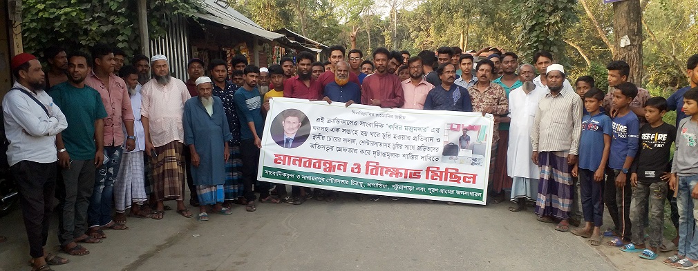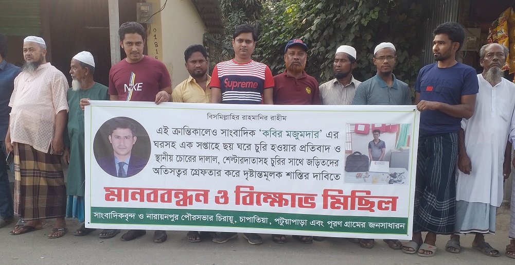 গত এক সপ্তাহে চাঁদপুরের মতলব দক্ষিণ উপজেলার নবগঠিত নারায়নপুন পৌরসভায় সাংবাদিক মো. কবির মজুমদার এর বসতঘর সহ প্রায় ১০টি বসত ঘরে চুরির প্রতিবাদ ও স্থানীয় চোরদের দালাল, শেল্টারদাতাসহ চুরির সাথে জড়িতদের অতিসত্বর গ্রেফতার করে দৃষ্টান্তমূলক শাস্তির দাবিতে মানববন্ধন ও বিক্ষোভ মিছিল করেছে এলাকাবাসী।